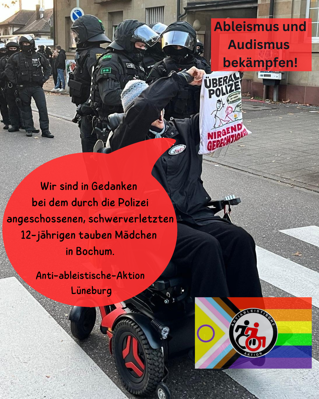 Ableismus und Audismus bekämpfen! 2025/11/18 fightableism Aktivistis der antiableistischen Aktion Lüneburg sind in Gedanken bei dem 12-Jährigen tauben Mädchen, das in Bochum durch die Polizei angeschossen und schwer verletzt wurde. Ableismus und Audismus bekämpfen!